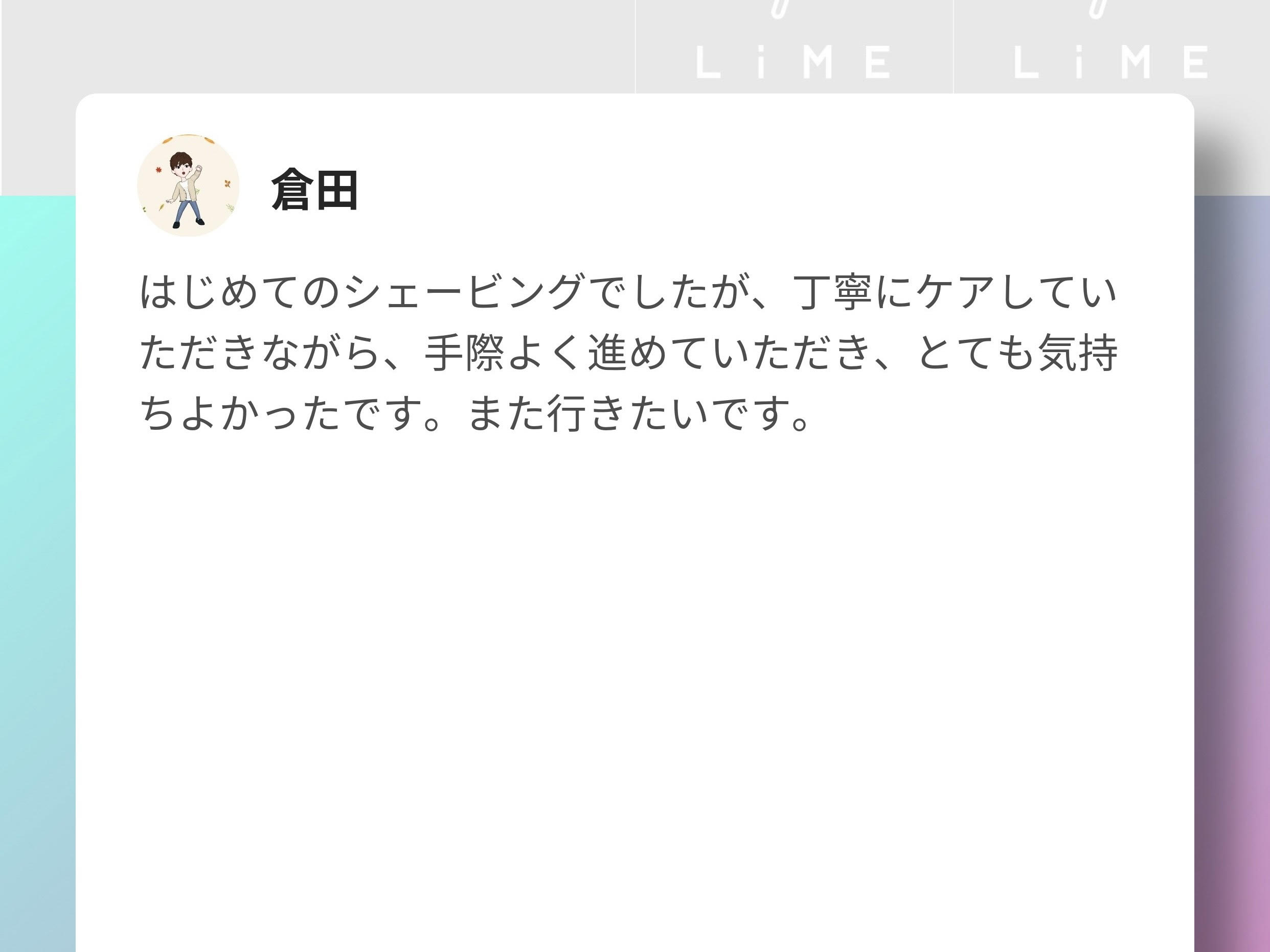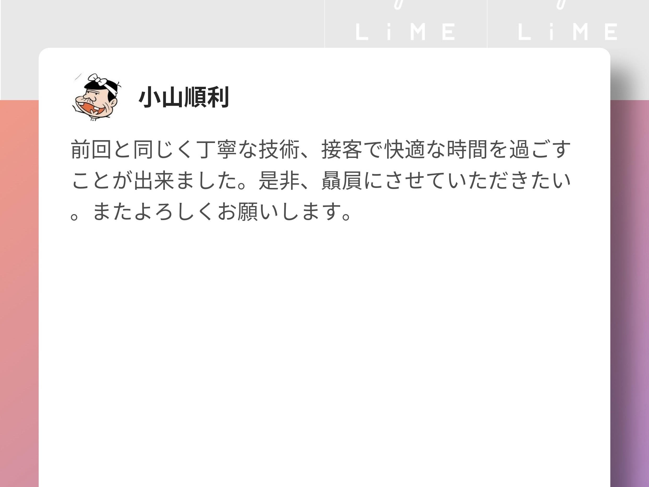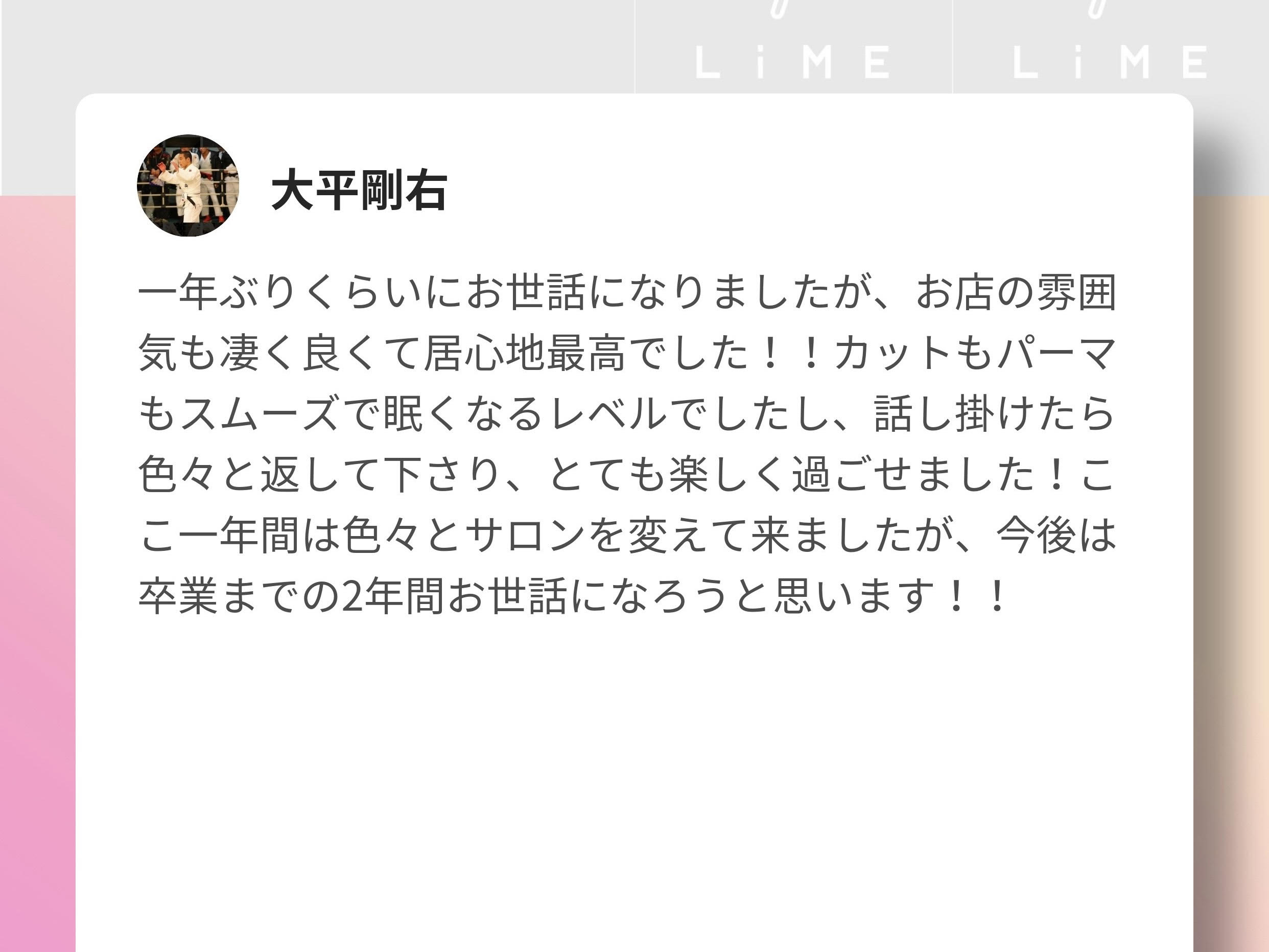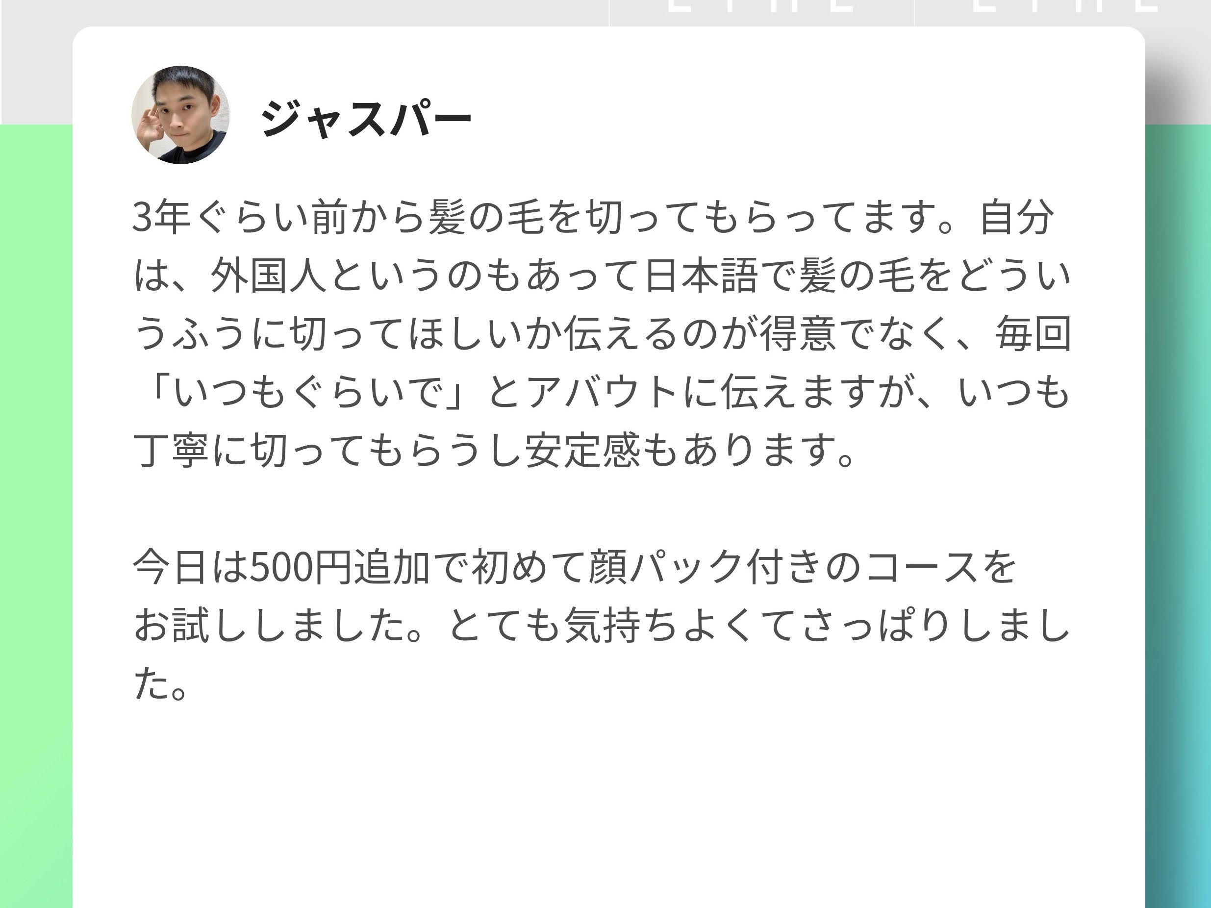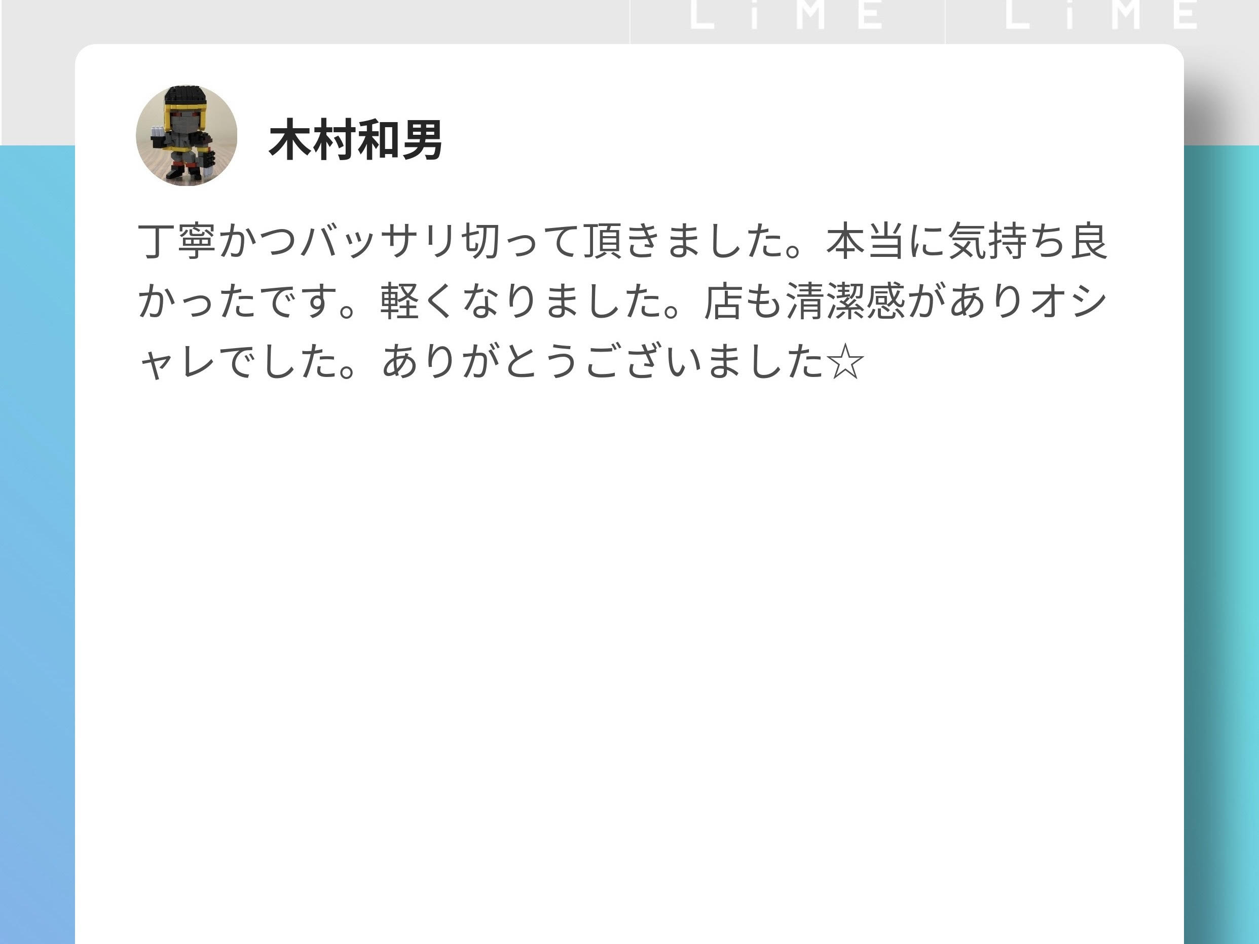 お客様から頂いたクチコミを掲載させて頂きます。 生のご感想なので、ご来店を迷っている方は是非参考にして頂けたらと思います! ※LIMEという(LINE予約)経由で頂いたクチコミを掲載させて頂いております。 すぐにLINE予約で空き状況を確認する↓ー-------------------- 早稲田 江戸川橋 高田馬場 理容室 美容室 美容院 ヘアサロン メンズサロン 床屋 顔そり シェービング